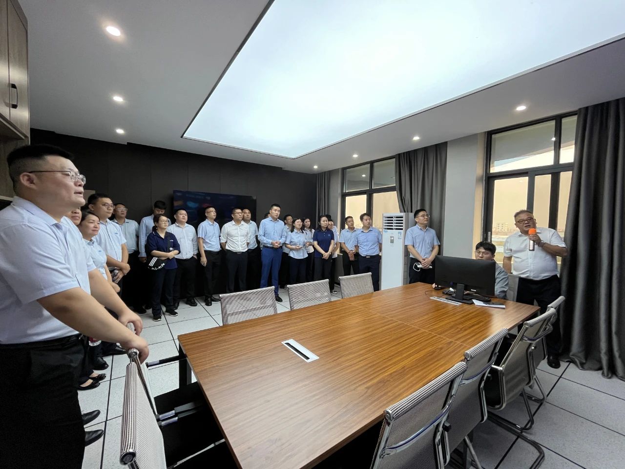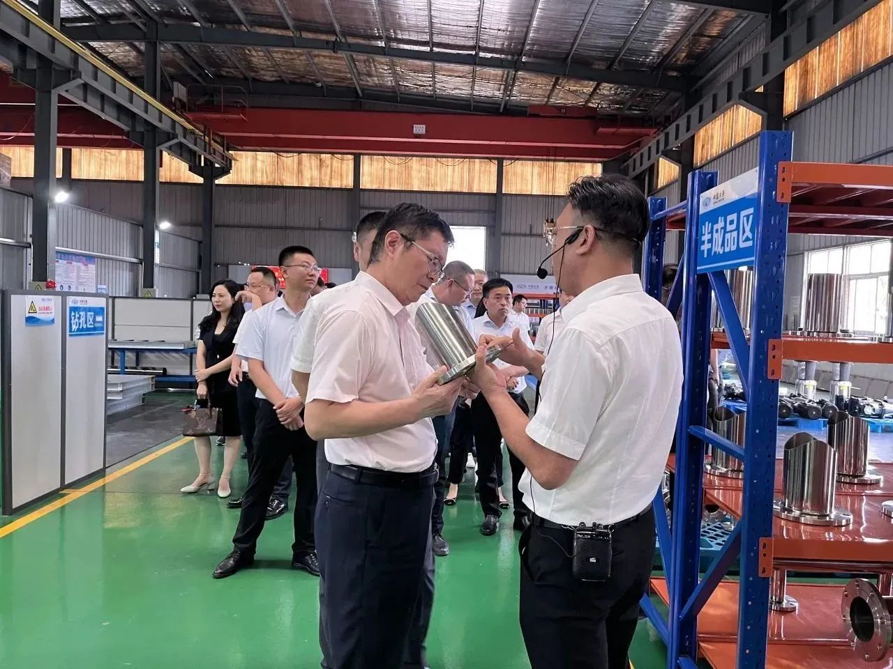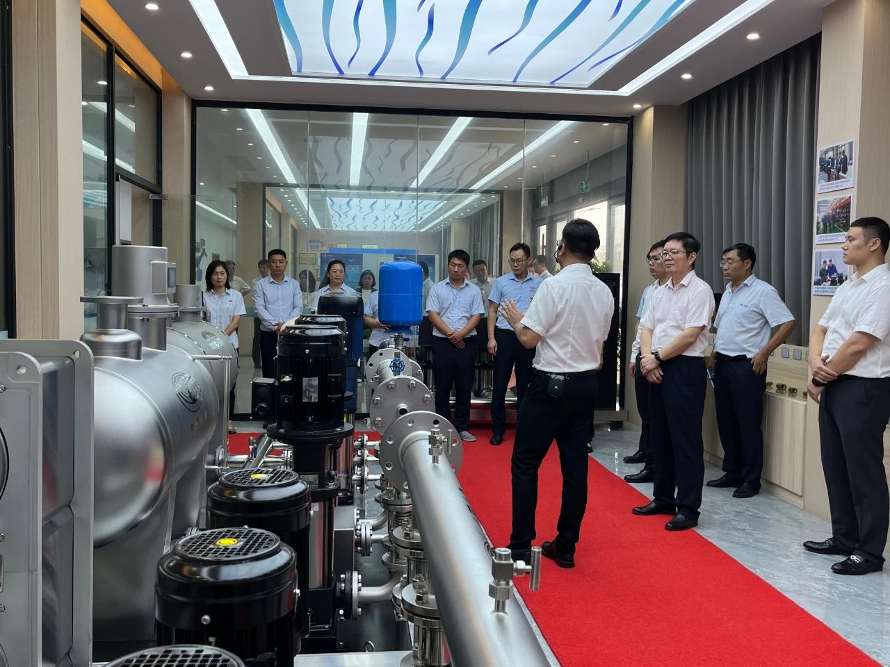 集團郭總在我司講解團的陪同下,帶領(lǐng)集團年輕干部培訓(xùn)班成員先后參觀了我司機械、電氣生產(chǎn)車間、成品庫、二次供水設(shè)備展廳、二次供水監(jiān)控管理平臺及數(shù)字化智慧水務(wù)平臺。